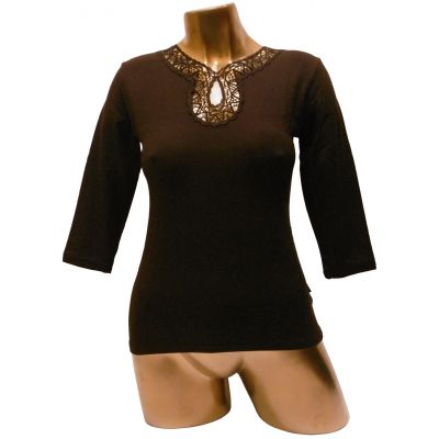 Bluzka z rękawem 3/4 i dekoltem wykończonym gipiurą.